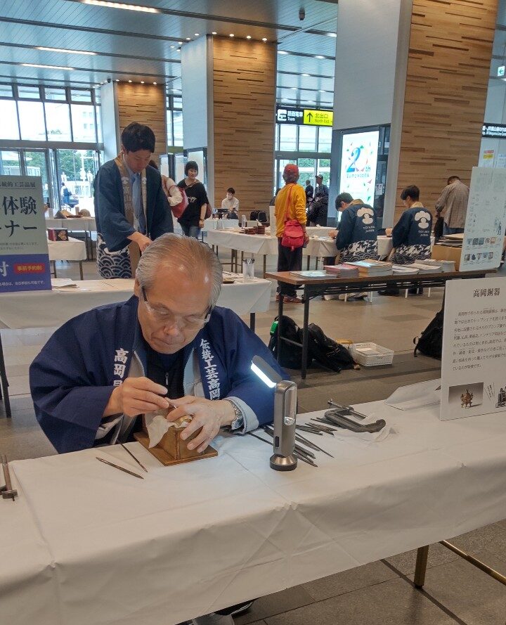 富山駅 南北自由通路では「高岡銅器」の伝統工芸士称号をもつ職人による実演ならびに製作体験が行われました。